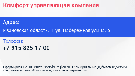 Комфорт, управляющая компания по адресу Ивановская область, Шуя, Набережная улица, 6 в дальнейшем Организация, размещена в следующих категориях: