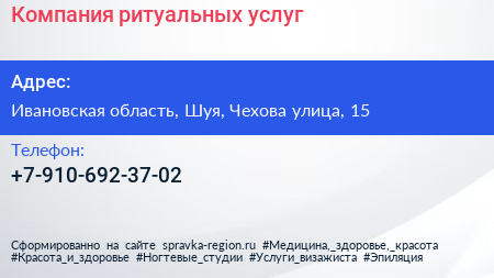 Компания ритуальных услуг по адресу Ивановская область, Шуя, Чехова улица, 15 в дальнейшем Организация, размещена в следующих категориях: