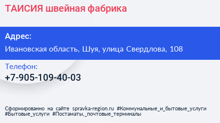 ТАИСИЯ, швейная фабрика по адресу Ивановская область, Шуя, улица Свердлова, 108 в дальнейшем Организация, размещена в следующих категориях: