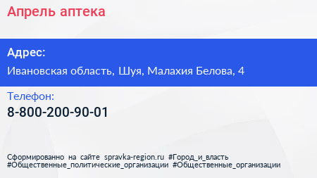 Апрель, аптека по адресу Ивановская область, Шуя, Малахия Белова, 4 в дальнейшем Организация, размещена в следующих категориях: