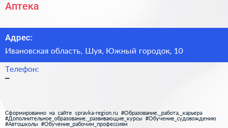 Аптека по адресу Ивановская область, Шуя, Южный городок, 10 в дальнейшем Организация, размещена в следующих категориях: