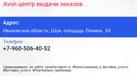 Avon, центр выдачи заказов по адресу Ивановская область, Шуя, площадь Ленина, 24 в дальнейшем Организация, размещена в следующих категориях: