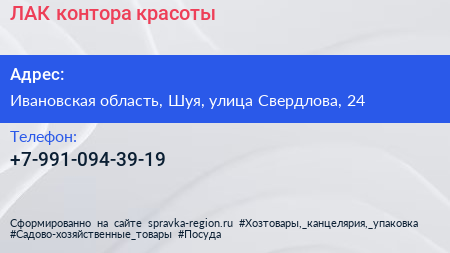 ЛАК, контора красоты по адресу Ивановская область, Шуя, улица Свердлова, 24 в дальнейшем Организация, размещена в следующих категориях: