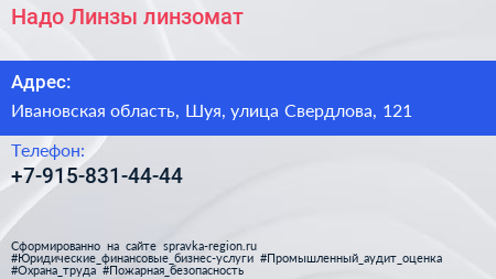 Надо Линзы, линзомат по адресу Ивановская область, Шуя, улица Свердлова, 121 в дальнейшем Организация, размещена в следующих категориях:
