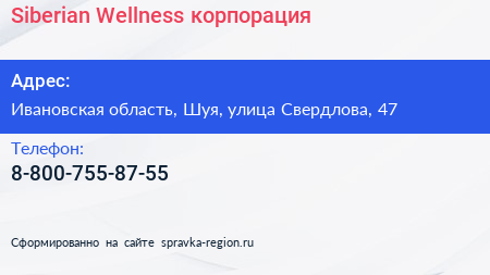 Siberian Wellness, корпорация по адресу Ивановская область, Шуя, улица Свердлова, 47 в дальнейшем Организация, размещена в следующих категориях: