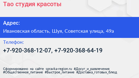 Тао, студия красоты по адресу Ивановская область, Шуя, Советская улица, 49а в дальнейшем Организация, размещена в следующих категориях:
