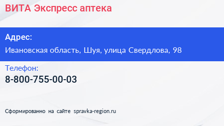 ВИТА Экспресс, аптека по адресу Ивановская область, Шуя, улица Свердлова, 98 в дальнейшем Организация, размещена в следующих категориях:
