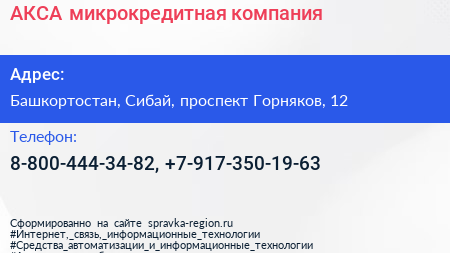 АКСА, микрокредитная компания по адресу Башкортостан, Сибай, проспект Горняков, 12 в дальнейшем Организация, размещена в следующих категориях: