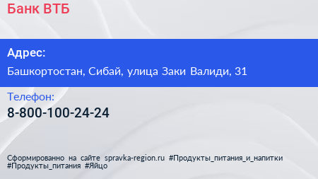 Банк ВТБ по адресу Башкортостан, Сибай, улица Заки Валиди, 31 в дальнейшем Организация, размещена в следующих категориях: