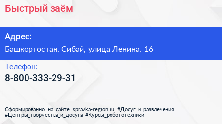 Быстрый заём по адресу Башкортостан, Сибай, улица Ленина, 16 в дальнейшем Организация, размещена в следующих категориях: