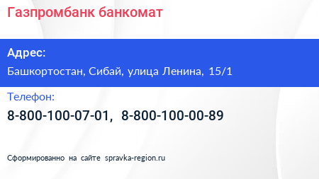 Газпромбанк, банкомат по адресу Башкортостан, Сибай, улица Ленина, 15/1 в дальнейшем Организация, размещена в следующих категориях: