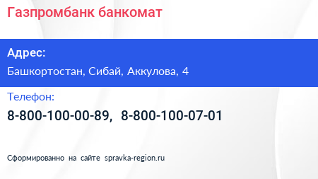 Газпромбанк, банкомат по адресу Башкортостан, Сибай, Аккулова, 4 в дальнейшем Организация, размещена в следующих категориях: