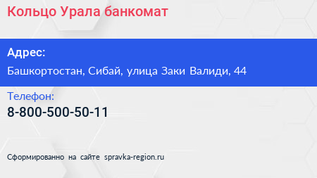 Кольцо Урала, банкомат по адресу Башкортостан, Сибай, улица Заки Валиди, 44 в дальнейшем Организация, размещена в следующих категориях: