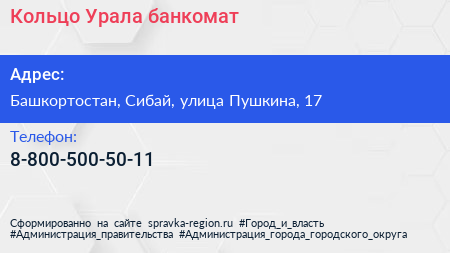 Кольцо Урала, банкомат по адресу Башкортостан, Сибай, улица Пушкина, 17 в дальнейшем Организация, размещена в следующих категориях: