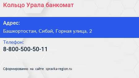 Кольцо Урала, банкомат по адресу Башкортостан, Сибай, Горная улица, 2 в дальнейшем Организация, размещена в следующих категориях: