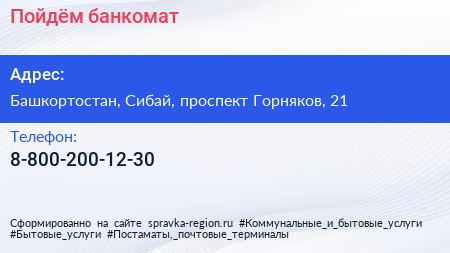 Пойдём!, банкомат по адресу Башкортостан, Сибай, проспект Горняков, 21 в дальнейшем Организация, размещена в следующих категориях: