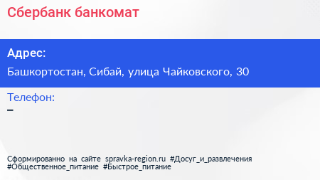 Сбербанк, банкомат по адресу Башкортостан, Сибай, улица Чайковского, 30 в дальнейшем Организация, размещена в следующих категориях: