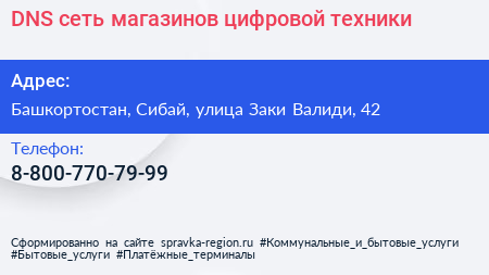 DNS, сеть магазинов цифровой техники по адресу Башкортостан, Сибай, улица Заки Валиди, 42 в дальнейшем Организация, размещена в следующих категориях: