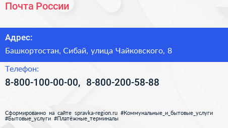 Почта России по адресу Башкортостан, Сибай, улица Чайковского, 8 в дальнейшем Организация, размещена в следующих категориях: