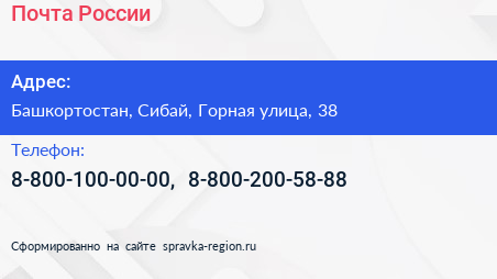 Почта России по адресу Башкортостан, Сибай, Горная улица, 38 в дальнейшем Организация, размещена в следующих категориях: