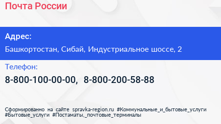 Почта России по адресу Башкортостан, Сибай, Индустриальное шоссе, 2 в дальнейшем Организация, размещена в следующих категориях: