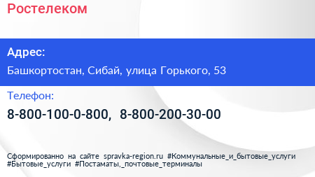 Ростелеком по адресу Башкортостан, Сибай, улица Горького, 53 в дальнейшем Организация, размещена в следующих категориях:
