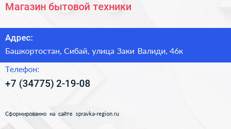 Магазин бытовой техники по адресу Башкортостан, Сибай, улица Заки Валиди, 46к в дальнейшем Организация, размещена в следующих категориях: