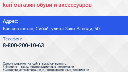 kari, магазин обуви и аксессуаров по адресу Башкортостан, Сибай, улица Заки Валиди, 50 в дальнейшем Организация, размещена в следующих категориях: