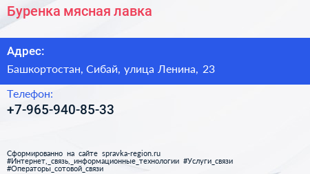 Буренка, мясная лавка по адресу Башкортостан, Сибай, улица Ленина, 23 в дальнейшем Организация, размещена в следующих категориях: