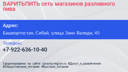 ВАРИТЬПИТЬ, сеть магазинов разливного пива по адресу Башкортостан, Сибай, улица Заки Валиди, 45 в дальнейшем Организация, размещена в следующих категориях:
