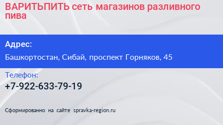 ВАРИТЬПИТЬ, сеть магазинов разливного пива по адресу Башкортостан, Сибай, проспект Горняков, 45 в дальнейшем Организация, размещена в следующих категориях: