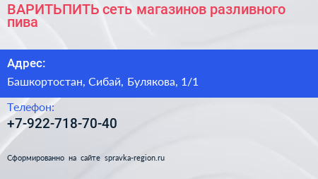 ВАРИТЬПИТЬ, сеть магазинов разливного пива по адресу Башкортостан, Сибай, Булякова, 1/1 в дальнейшем Организация, размещена в следующих категориях: