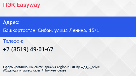 ПЭК: Easyway по адресу Башкортостан, Сибай, улица Ленина, 15/1 в дальнейшем Организация, размещена в следующих категориях: