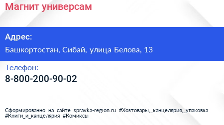 Магнит, универсам по адресу Башкортостан, Сибай, улица Белова, 13 в дальнейшем Организация, размещена в следующих категориях: