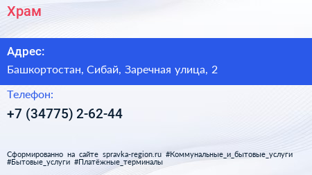 Храм по адресу Башкортостан, Сибай, Заречная улица, 2 в дальнейшем Организация, размещена в следующих категориях: