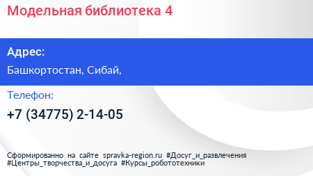 Модельная библиотека №4 по адресу Башкортостан, Сибай, в дальнейшем Организация, размещена в следующих категориях: