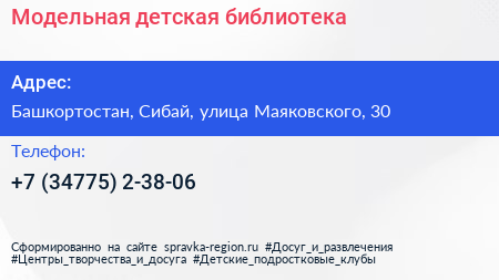 Модельная детская библиотека по адресу Башкортостан, Сибай, улица Маяковского, 30 в дальнейшем Организация, размещена в следующих категориях: