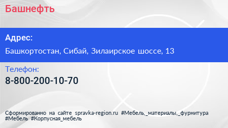Башнефть по адресу Башкортостан, Сибай, Зилаирское шоссе, 13 в дальнейшем Организация, размещена в следующих категориях: