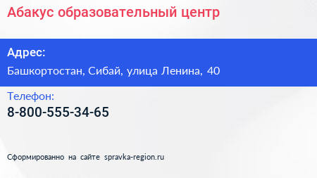 Абакус, образовательный центр по адресу Башкортостан, Сибай, улица Ленина, 40 в дальнейшем Организация, размещена в следующих категориях: