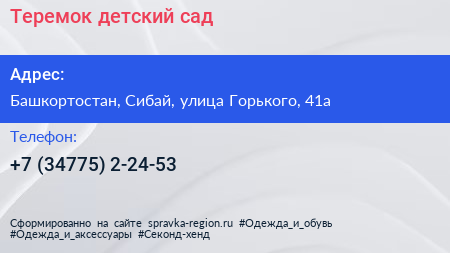 Теремок, детский сад по адресу Башкортостан, Сибай, улица Горького, 41а в дальнейшем Организация, размещена в следующих категориях: