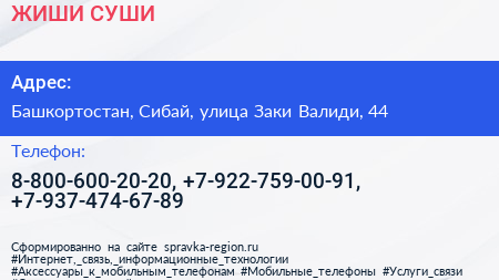 ЖИШИ СУШИ по адресу Башкортостан, Сибай, улица Заки Валиди, 44 в дальнейшем Организация, размещена в следующих категориях: