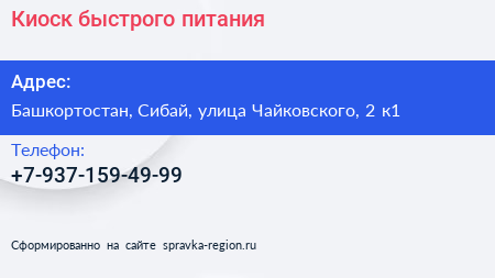Киоск быстрого питания по адресу Башкортостан, Сибай, улица Чайковского, 2 к1 в дальнейшем Организация, размещена в следующих категориях: