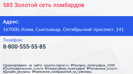 585*Золотой, сеть ломбардов по адресу 167000, Коми, Сыктывкар, Октябрьский проспект, 141 в дальнейшем Организация, размещена в следующих категориях: