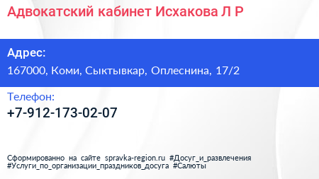 Адвокатский кабинет Исхакова Л.Р. по адресу 167000, Коми, Сыктывкар, Оплеснина, 17/2 в дальнейшем Организация, размещена в следующих категориях: