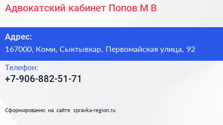 Адвокатский кабинет Попов М.В. по адресу 167000, Коми, Сыктывкар, Первомайская улица, 92 в дальнейшем Организация, размещена в следующих категориях:
