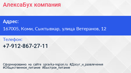 АлексаБух, компания по адресу 167005, Коми, Сыктывкар, улица Ветеранов, 12 в дальнейшем Организация, размещена в следующих категориях: