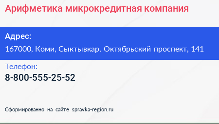 Арифметика, микрокредитная компания по адресу 167000, Коми, Сыктывкар, Октябрьский проспект, 141 в дальнейшем Организация, размещена в следующих категориях: