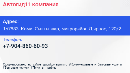 Автогид11, компания по адресу 167983, Коми, Сыктывкар, микрорайон Дырнос, 120/2 в дальнейшем Организация, размещена в следующих категориях: