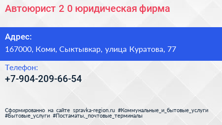 Автоюрист 2.0, юридическая фирма по адресу 167000, Коми, Сыктывкар, улица Куратова, 77 в дальнейшем Организация, размещена в следующих категориях: