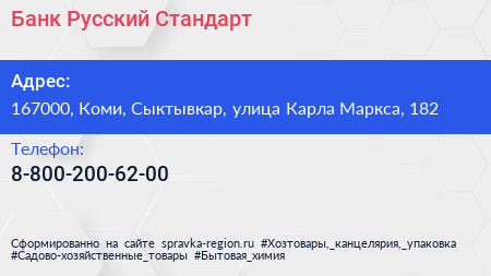 Банк Русский Стандарт по адресу 167000, Коми, Сыктывкар, улица Карла Маркса, 182 в дальнейшем Организация, размещена в следующих категориях: